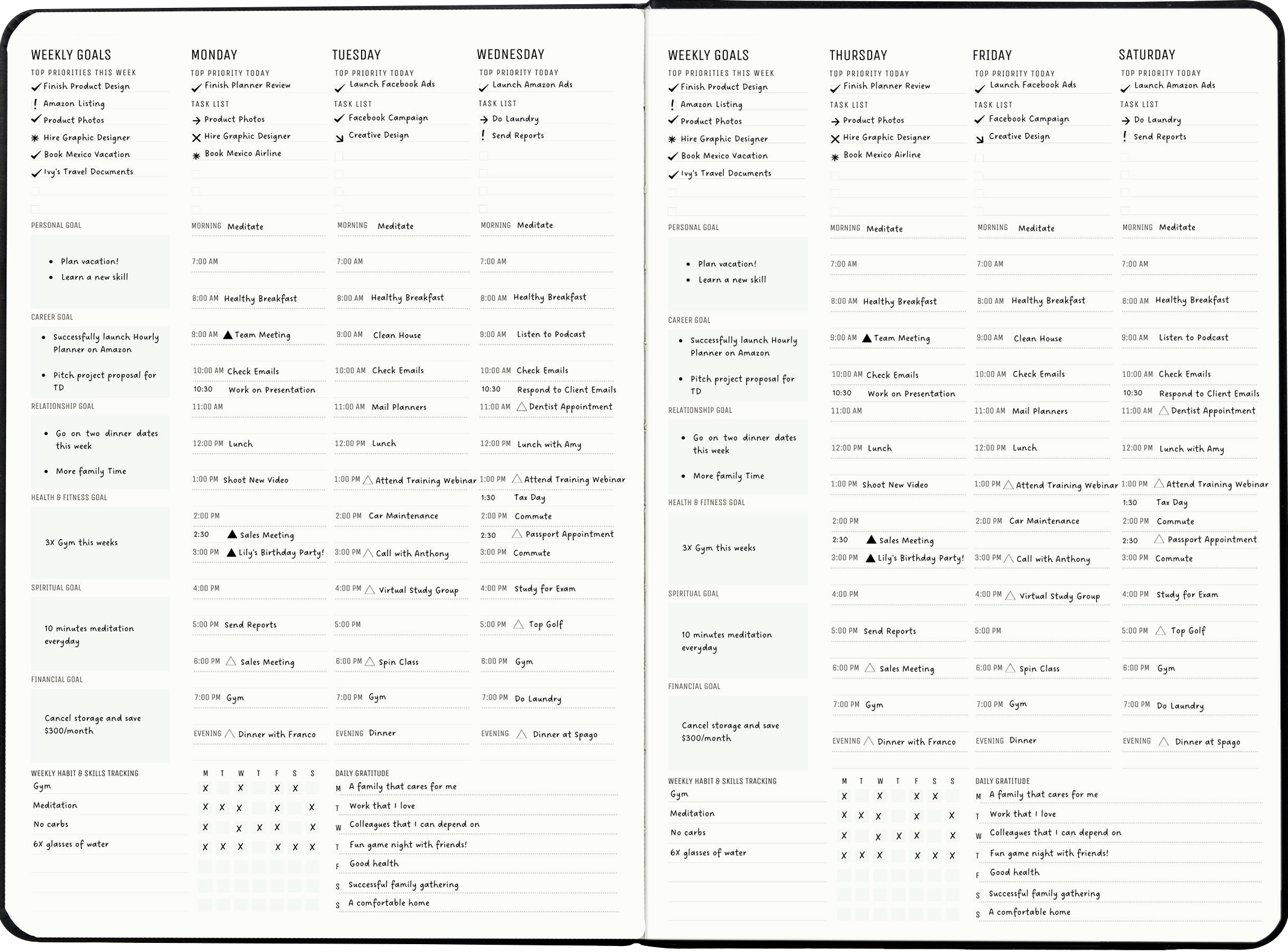 Make the most of every week with a well-organized and efficient spread to oversee your daily goals and hourly appointments. It offers a structured format for systematically planning, coordinating, and evaluating your tasks and activities throughout the week.