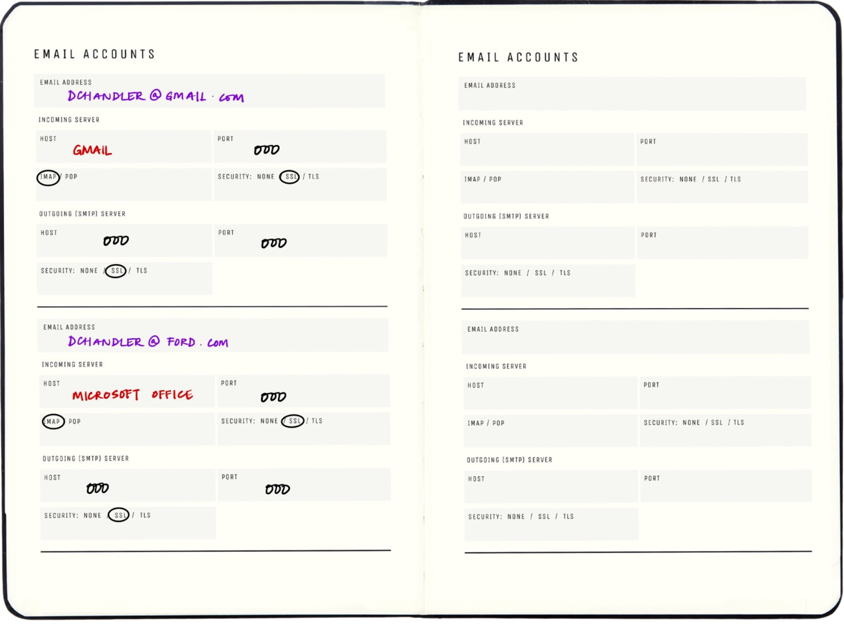 Easily document your email account information, including incoming and outgoing server details, for efficient access and management.