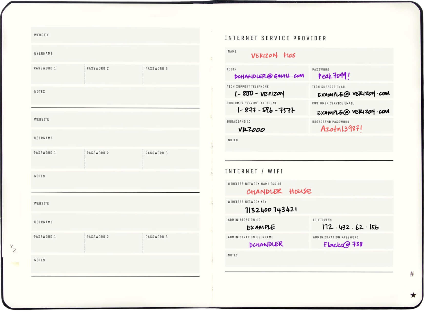 Make Internet service provider information management more efficient by securely noting down login information, passwords, tech support contacts, and customer service details in a single, accessible location.