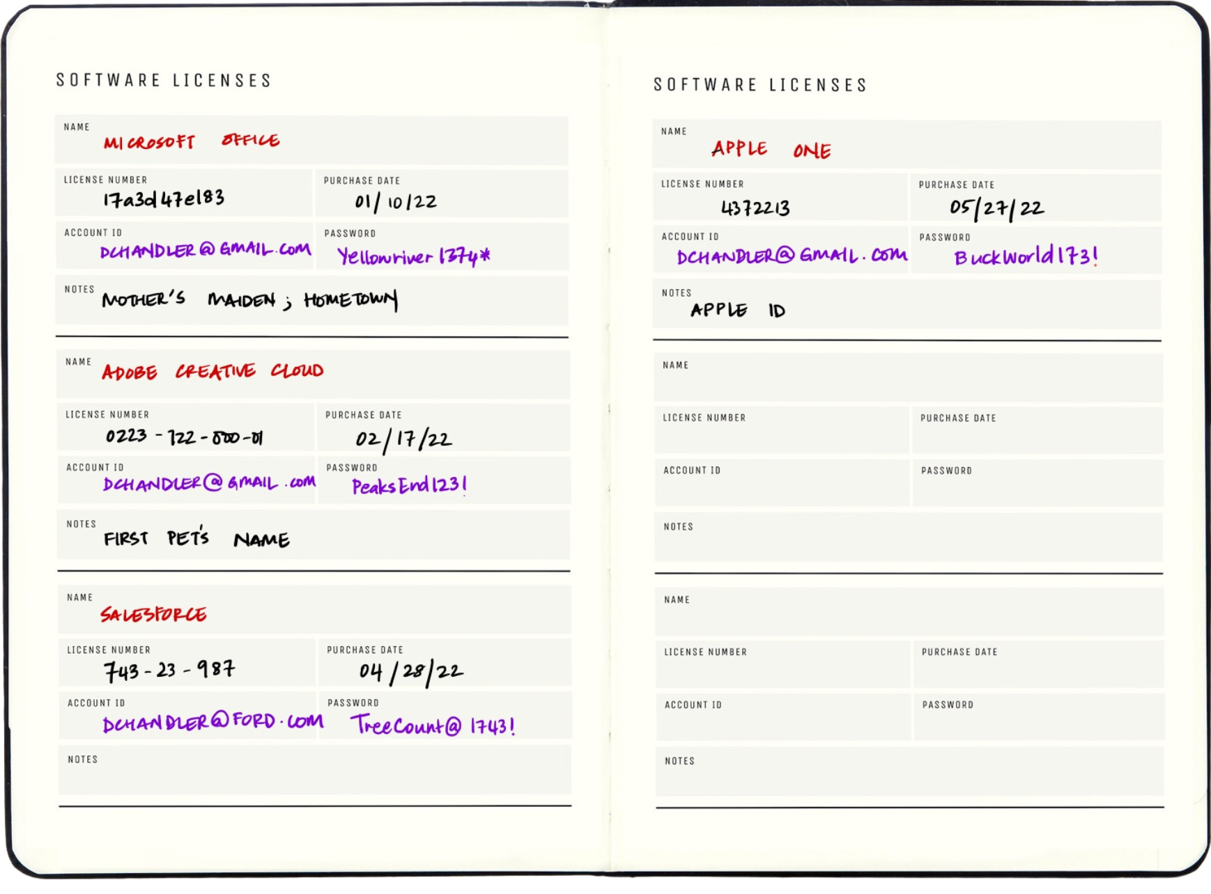 Efficiently manage software licenses by recording usernames, license numbers, purchase dates, account IDs, passwords, and extra notes handy password hints.